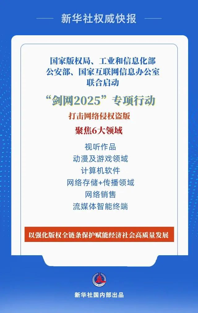 近日,国家版权局、工业和信息化部、公安部、国家互联网信息办公室四部门近日联合启动打击网络侵权盗版“剑网2025”专项行动,这是全国持续开展的第21次打击网络侵权盗版专项行动。